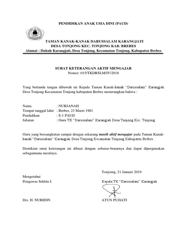 Neglasari no.17 desa bendasari kec sadananya . Format surat keterangan ini bisa anda gunakan untuk anda yang mengajar di paud, . Kepala sekolah contoh sk aktif mengajar guru paud 25 surat keterangan aktif . Contoh format surat aktif mengajar untuk guru honorer surat. Surat keterangan aktif mengajar paud al amin.