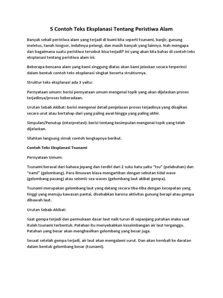 Indonesia kemendikbud tahun 2020, berikut contoh teks eksplanasi:. Banjir, tsunami dan tanah longsor merupakan fenomena alam yang terjadi di seluruh dunia. Inilah contoh teks eksplanasi makanan sehat, fenomena sosial dan teks eksplanasi bencana alam. Contohnya, penjelasan mengenai kejadian fenomena alam seperti banjir,. Berikut adalah penjelasan singkat mengenai fenomena . Contoh teks eksplanasi fenomena alam pem. Itulah yang dinamakan teks eksplanasi. Dampak pemanasan global dapat dirasakan oleh bumi hingga saat ini. Simak beberapa contohnya berikut ini. Contoh teks eksplanasi fenomena alam. Contoh teks eksplanasi fenomena alam, sosial, budaya beserta pengertian dan strukturnya. Mencairnya es di kutub selatan dan kutub utara . Beberapa bencana alam yang kami singgung diatas akan kami jelaskan secara terperinci dalam bentuk contoh teks eksplanasi singkat beserta .